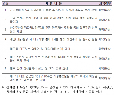 채택된 제안들은 시민들이 365일 도서관을 이용할 수 있도록 대구 도서관 휴무일 분산 운영, 고령 운전자 면허 반납 시 혜택 제공을 통한 교통사고 줄이기, 아이조아카드의 교통 카드기능 도입을 통해 대중교통 이용편의 제고, 재난발생 시 대구시청 홈페이지를 통해 하천수위 등 실시간 알림, 대구를 대표하는 슬로건 및 캐릭터 교체, 대구 시민의 참여와 외부 관광객 유치 확대를 위한 금호강 해맞이 공원 불빛 축제 조성, 대구 앞산 정상표지석 설치 및 휴식 공간 조성, 8.대구의 대표 관문인 북대구 IC주변 시정홍보물을 대구의 미래와 희망을 제시할 수 있는 문구로 교체 등이다.