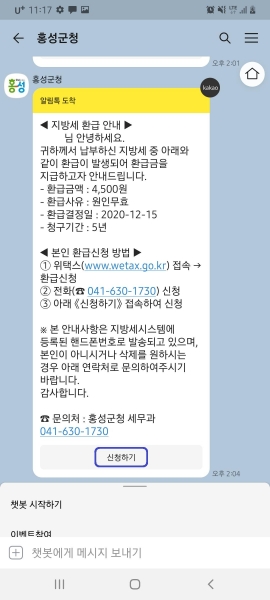 주민이 직접 세톡서비스를 신청해야 하는 타 지자체와 달리 홍성군은 환급 대상자를 직접 찾아 카카오톡을 통해 환급안내문을 전달하고 본인 인증과 계좌기입 등의 간단한 과정을 통해 신속하고 편리하게 환급을 받을 수 있도록 구축했다.