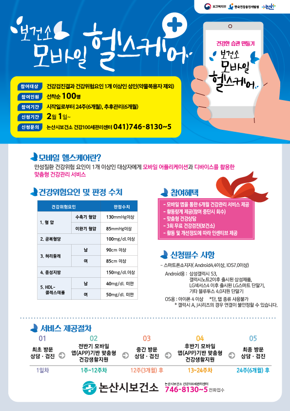 신청자격은 스마트폰 사용이 가능한 만19세 이상 논산시 거주자로. 혈압, 공복혈당, 허리둘레, 중성지방, 콜레스테롤등 5가지 건강위험요인 중 1개 이상을 보유한 비질환자이며 약물 복용자는 제외된다.
