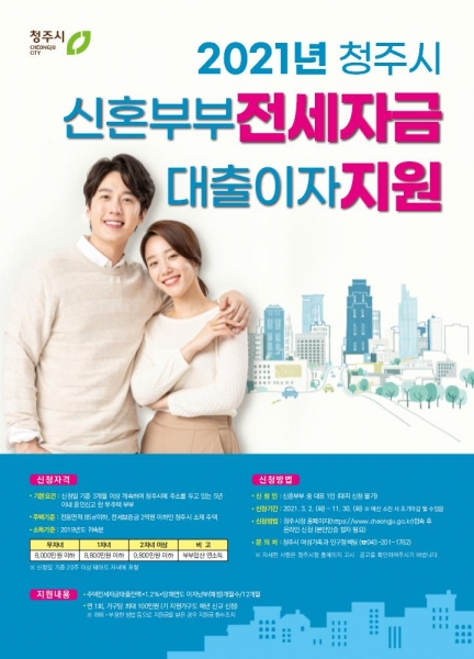 지원 대상은 신청일 기준 5년 이내 혼인신고 한 신혼부부 세대구성원 모두 전국 기준 무주택 신청일 기준 3개월 이상 계속해 청주시에 주소를 두고 임대차계약서 대상 주택으로 전입된 가구 등 기본 요건을 충족해야 하며 청주시 소재 공급면적 85㎡ 이하 전세보증금 2억원 이하인 주택이어야 한다.