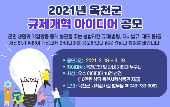 [충청뉴스큐] 옥천군은 경제활동과 주민생활에 걸림돌이 되는 각종 규제를 발굴·개선하기 위해 18일부터 오는 3월 19일까지 30일간 ‘규제개혁 아이디어 공모’를 추진한다고 밝혔다.