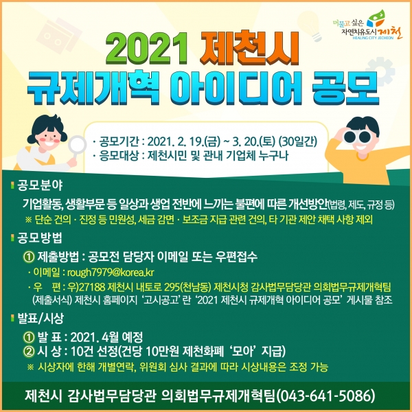 [충청뉴스큐] 제천시가 기업 활동에 걸림돌이 되거나 시민생활에 불편을 주는 불합리한 규제를 시민과 함께 발굴하고 개선하기 위해 ‘2021 제천시 규제개혁 아이디어 공모’를 실시한다.