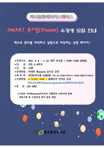 오는 3월부터 운영하는 ‘SMART 북스팀’은 책으로 원리를 파악하고 실험으로 터득하는 실험과학 메이커로 울림 레이저 만들기 소리 현악기 만들기 그림자 극장 태양광풍차 만들기 스마트 홈 만들기 등 매 수업마다 과학의 원리를 이해하고 다양한 메이킹 활동으로 진행된다.