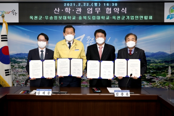 옥천군은 22일 오후 옥천군청 상황실에서 충북도립대학교, 우송정보대학교, 옥천군기업인연합회와 옥천군 맞춤형 취업정책지원을 위한 산·학·관 업무 협약식을 체결했다.