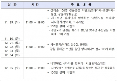 특히, 본행사의 대대적 홍보를 위해서 이마트 성수점에서는 29일 오전 11시에 정만호 경제부지사를 비롯해 민영선 이마트 상무, 강목점 속초수협상임이사 등이 참석한 가운데 오픈행사가 열린다. 오픈행사에는 오징어, 코다리 등 수산물 증정이벤트와 개그우먼 김지민과 함께하는 방어회, 코다리찜의 시식행사가 함께 진행된다.
