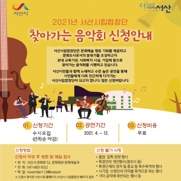 [충청뉴스큐] 서산시가 코로나19 극복을 위해 4월부터 관내 교육기관·사회복지 시설 등을 대상으로 ‘2021년 찾아가는 음악회’를 실시한다.