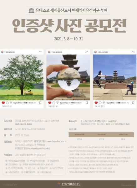 [충청뉴스큐] 부여군시설관리공단은 오는 10월 31일까지 부여군시설관리공단 인증샷 사진 공모전 접수를 받는다.