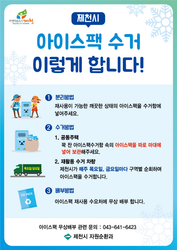 한번 사용하고 버려지는 아이스팩은 불에 타지도 않고 대부분 쓰레기로 매립되고 있는 환경오염의 주범으로 시는 적극적인 아이스팩 재사용 유도를 통해 자원순환사회 조성에 노력을 기울이고 있다.
