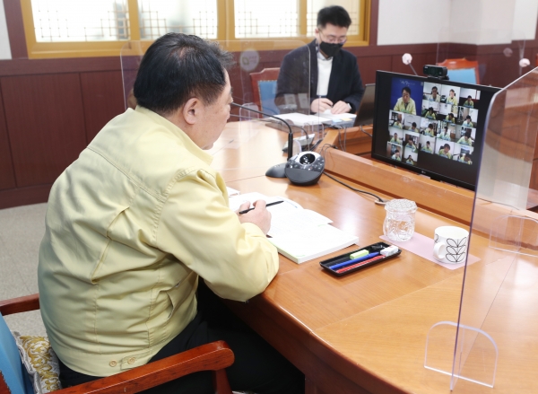 [충청뉴스큐] 한범덕 청주시장이 15일 오전 8시 40분 소회의실에서 온라인 영상회의로 열린 주간업무 보고회에서 다가오는 벚꽃 개화기를 맞아 철저한 방역에 힘써달라고 강조했다.