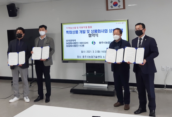 [충청뉴스큐] 충주시가 충주농산물을 활용한 특화상품 개발을 위해 지역 내 유통업체와 맞손을 잡았다충주시농업기술센터는 지난해 12월부터 3월까지 5개 가공 및 유통업체와 업무협약식을 갖고 충주농산물을 활용한 특화상품 개발 및 상품화를 위한 발판을 마련했다.
