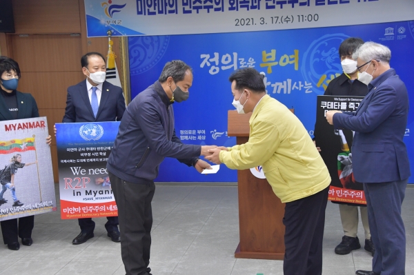 이날 기자회견에는 진광식 부여군의회 의장과 윤택영, 박상우, 민병희, 정태영의원을 비롯해 얀 나잉툰 미얀마NLD 한국지부장, 소모뚜 독재타도 위원장, 김정민 미얀마민주주의네트워크 간사, 이상근 미얀마민주주의네트워크 고문 등 미얀마 민주주의 네트워크 인사들도 자리를 함께 했다.