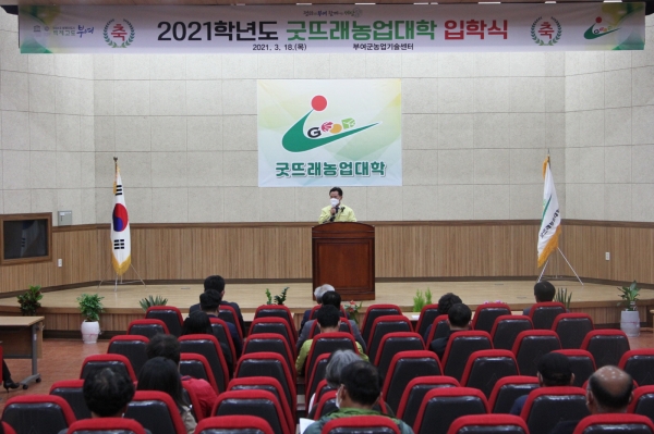 [충청뉴스큐] 부여군이 지난 18일 부여군농업기술센터 대강당에서 무한경쟁의 글로벌 농업환경에 능동적으로 대응하고 시대변화에 도전하는 유능한 전문인력 양성을 위한 2021학년도 굿뜨래농업대학 입학식을 갖고 본격적인 학사일정에 들어갔다.