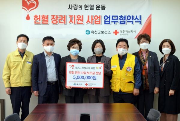 [충청뉴스큐] 옥천군보건소는 대한적십자사 충북혈액원과 22일 충북 혈액원과 원활한 혈액수급과 헌혈 장려를 위한‘헌혈 장려 지원 사업’업무협약식을 개최했다.