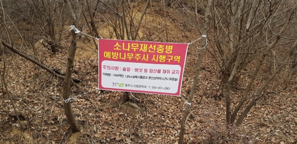 청주시에서는 지난 2016년 최초로 발견된 이후 지금까지 총 76본의 피해목이 발생했고 추가 확산 피해방지를 위해 3만 6940본에 대해 나무주사를 실시한 바 있다.