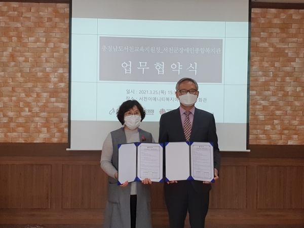 [충청뉴스큐] 서천군 장애인종합복지관은 지난 25일 특수교육 대상학생 교육 및 사업 공유를 위해 충청남도 서천교육지원청과 업무 협약식을 가졌다.