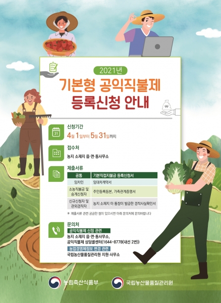 기본형 공익직불금은 소농직불금과 면적직불금으로 나누어서 신청하면 되며 농가 단위로 지급되는 소농직불금을 신청하기 위해서는 농가 구성원 정보 확인을 위해 주민등록등본과 가족관계증명서를 구비해 농가 구성원을 모두 기재한 후 개별 서명해 신청해야 한다.