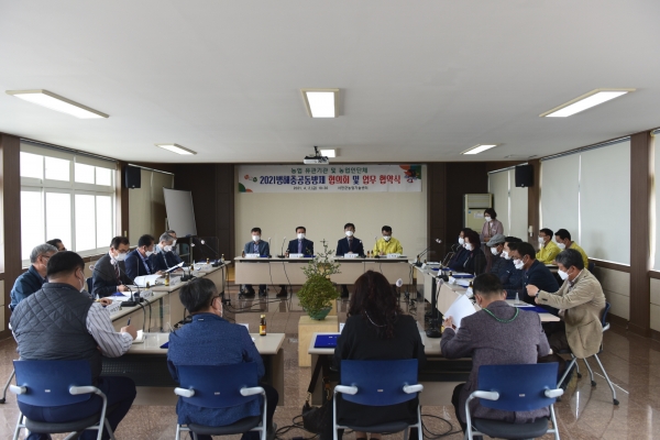 2021년 1차 병해충 공동방제 협의회는 농업기술센터, 농정과, 농·축협, 9개 농업인 단체 등 기관·단체장 19명이 참석해 올해 기상변화에 따른 병해충 발생 동향, 예측상황 정보를 공유하고 긴급상황 발생 시 대처 방안과 공동방제단 구성 등을 논의했다.