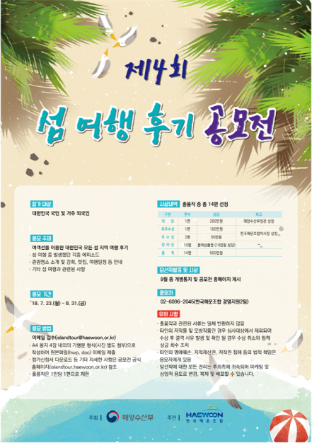 대한민국에 거주하고 있다면 누구나 공모전에 참여할 수 있으며, 섬 여행 중 있었던 일화나 섬 관광명소·맛집 등을 소개하는 후기를 작성하여 23일부터 오는 8월 31일까지 이메일로 접수하면 된다. 참가신청서와 기타 안내사항은 공모전 공식 누리집에서 확인할 수 있다.
