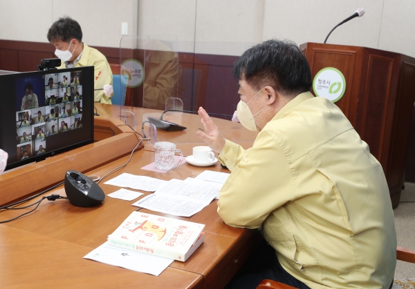 [충청뉴스큐] 한범덕 청주시장이 5일 소회의실에서 온라인 영상회의로 열린 주간업무 보고회에서 음식섭취 목적 외 시설에서 음식섭취를 금지하고 마스크를 써 감염을 막을 수 있도록 협조해달라고 호소했다.