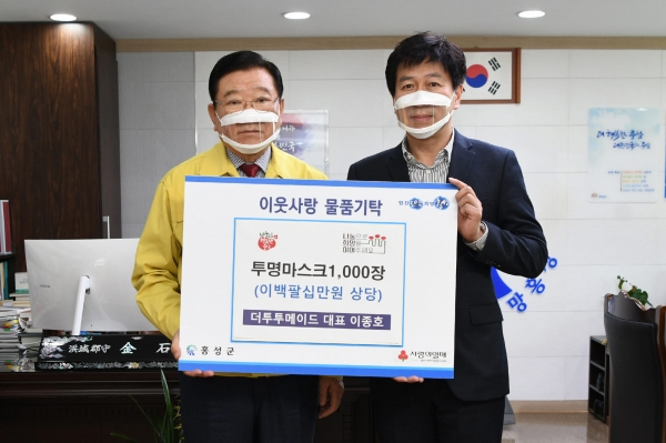 [충청뉴스큐] 홍성군은 더투투메이드 이종호 대표로부터 입 모양이 보이는 투명 마스크 1,000장를 기탁 받았다.
