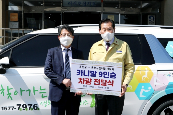 [충청뉴스큐] 옥천군은 지난 7일 오후 군청 현관에서 관내 장애인들의 체육활동 편의를 위해 차량을 전달식을 가졌다.