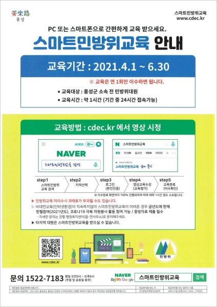 교육은 홍성군청 홈페이지나 스마트민방위교육 사이트에 접속한 뒤 본인인증을 거쳐 24시간 수강할 수 있으며 교육시간은 1시간이다.