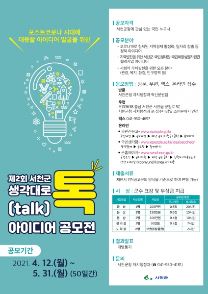 [충청뉴스큐] 서천군이 포스트 코로나 시대에 대응할 국민들의 창의적인 아이디어 발굴을 위해 12일부터 다음달 31일까지 제2회 ‘생각대로 톡’ 아이디어 공모전을 개최한다고 밝혔다.