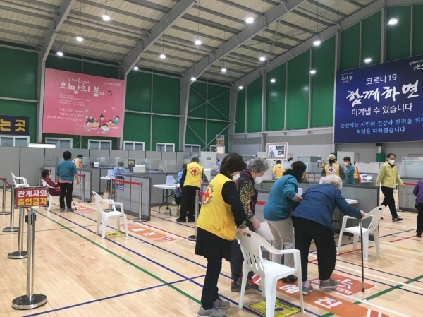 또한 논산시자원봉사센터를 중심으로 관내 봉사단체 회원들이 동선 안내와 체온측정, 모니터링에 참여했으며 특히 거동이 불편한 어르신들을 일대일로 보살피며 신속하고 안전한 접종 진행에 힘을 보탰다.