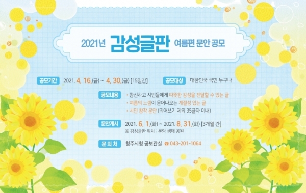 [충청뉴스큐] 청주시가 이달 16일부터 30일까지 시민들과의 감성 소통을 위한‘감성글판’ 여름편 문안을 공모한다.