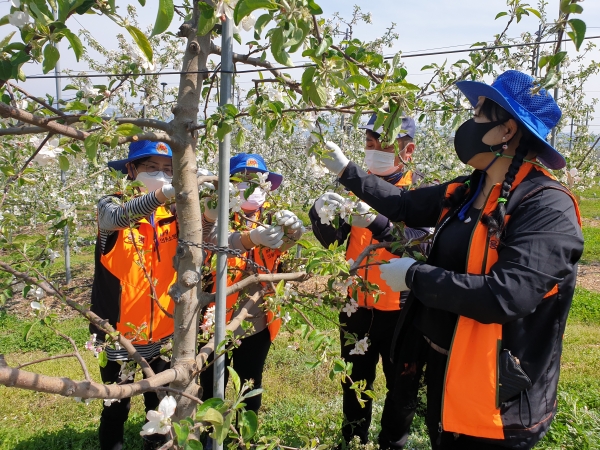 한창 과수작업이 이루어지는 시기에 일손부족으로 어려움을 겪고 있는 연탄리 농가에 5명이 참여해 사과적과 작업을 펼치며 구슬땀을 흘렸다.