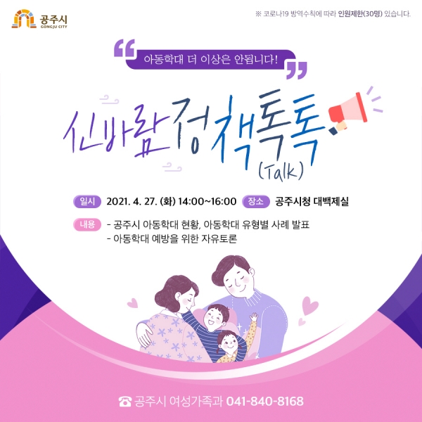 [충청뉴스큐] 공주시는 오는 27일 오후 2시 시청 대백제실에서 아동학대 예방을 주제로 26번째 신바람 정책톡톡 토론회를 개최한다.