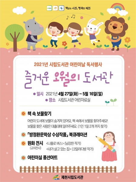 [충청뉴스큐] 제천시립도서관은 어린이날을 맞아 오는 27일부터 다음달 16일까지‘즐거운 오월의 도서관’이란 주제로 독서행사를 운영한다.