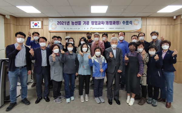 이날 수료식에는 교육생 23명 중 출석률 80% 이상인 22명이 수료증을 받았으며 이들은 앞으로 농산물 가공 지원센터에서 제품개발을 위한 가공코칭, 공정표준화 단계를 거쳐 가공제품을 생산·판매할 수 있게 된다.