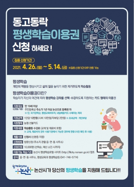 [충청뉴스큐] 논산시가 오는 5월 14일까지 읍·면사무소 및 동 주민센터를 통해 ‘동고동락 평생학습이용권’을 신청 접수한다.
