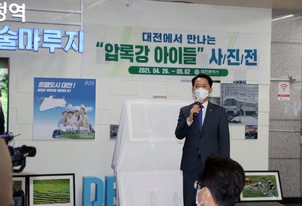 [충청뉴스큐] 대전광역시의회 권중순 의장은 26일 도시철도 대전시청역에서 열린 압록강 아이들 사진전 개막식에 참석했다.