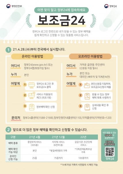 ‘보조금24’ 서비스는 정부24 홈페이지 접속 또는 모바일을 이용한 온라인 신청이 가능하다.