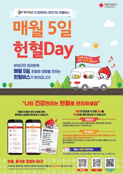 특히 군은 주요 헌혈대상인 학생·단체 등이 지난해 코로나19 확산으로 인해 참여율이 저조한 데 따른 대응책으로 올해 1월부터 매월 5일을 ‘헌혈의 날’로 지정해 부여군청 앞마당에서 지역주민 누구나 참여할 수 있는 정기적인 헌혈사업을 운영하고 있다.