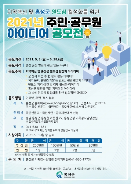 [충청뉴스큐] 홍성군은 군 청사 이전에 따른 원도심 공동화를 방지하고 도심 활성화를 위한 참신하고 창의적인 아이디어를 발굴해 군 정책에 반영하고자 5월 3일부터 28일까지 4주간 ‘2021년 주민·공무원 아이디어 공모전’을 개최한다.