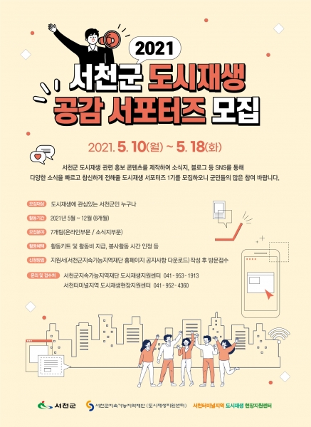 [충청뉴스큐] 서천군지속가능지역재단은 도시재생사업에 대한 주민 참여 확대와 홍보를 위한 ‘2021 도시재생 공감 서포터즈’를 이달 3일부터 18일까지 모집한다.