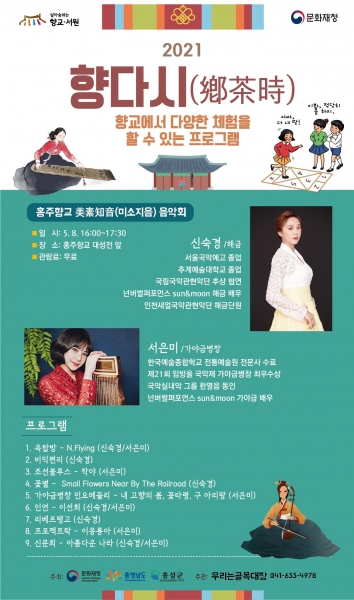 홍성군에 따르면 이번 공연은 홍주향교 대성전을 배경으로 신숙경의 해금연주와 서은미의 가야금병창이 만나 아름다운 우리 전통의 소리로 흥겨운 어버이날을 선사할 예정이다.
