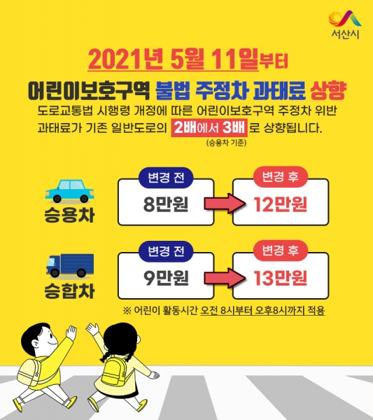 [충청뉴스큐] 서산시가 11일부터 어린이보호구역 내 주정차 위반 시 과태료를 최대 13만원까지 상향됨에 따라 주의를 당부하고 나섰다.