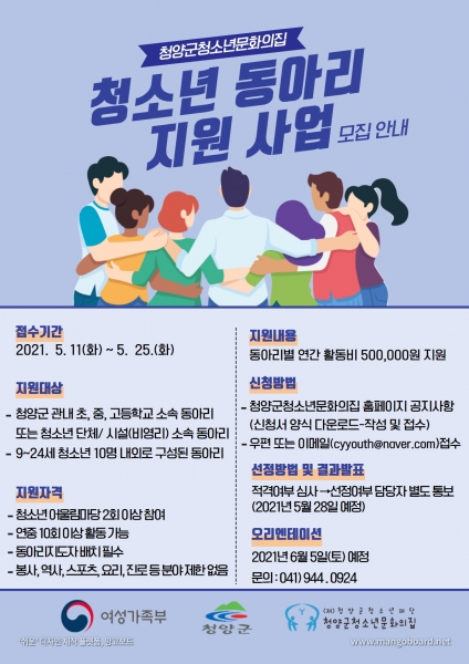 [충청뉴스큐] 청양군청소년재단이 청소년들의 주도적 활동을 지원하기 위해 동아리 지원사업 대상단체를 오는 25일까지 모집한다고 14일 밝혔다.