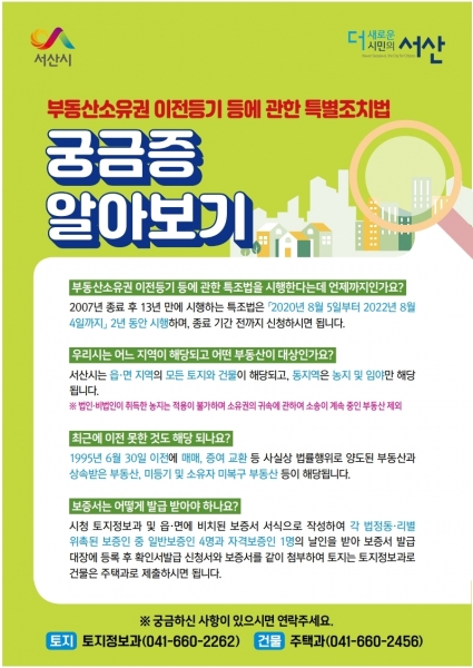 [충청뉴스큐] 서산시가 내년 8월 4일까지 한시적으로 ‘부동산소유권 이전등기 등에 관한 특별조치법’을 추진한다고 17일 밝혔다.