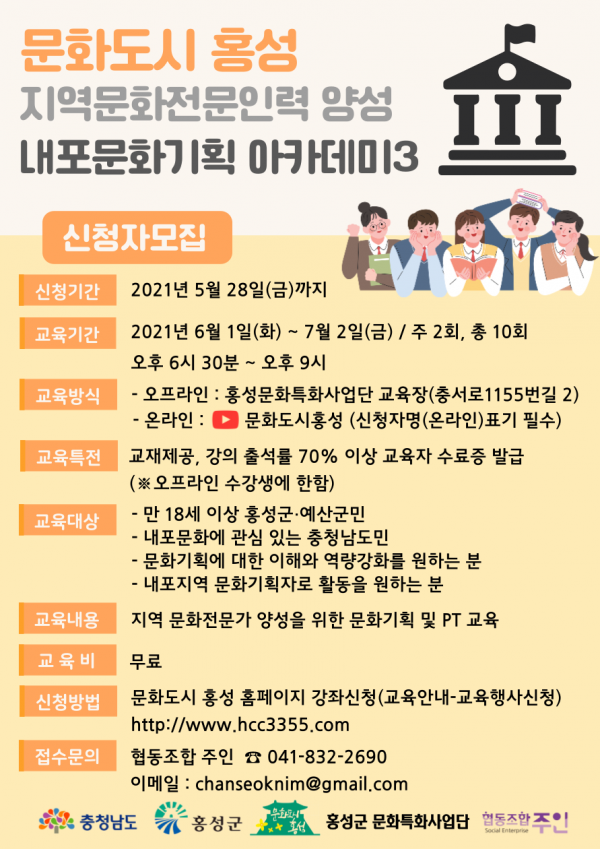 [충청뉴스큐] 홍성군은 문화특화지역 조성사업 추진사업단에서 진행하는 ‘내포문화기획 아카데미 시즌 3’수강생을 28일까지 모집한다고 밝혔다.