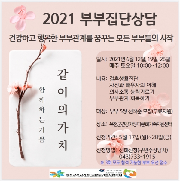 군 관계자는“부부관계 개선이 필요한 부부들에게 집단상담 서비스를 지원함으로써 옥천군 내 가족의 가족건강성 증진을 지원할 수 있도록 최선을 다하겠다”고 전했다.