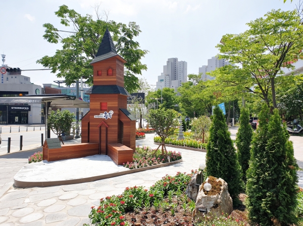 공용터미널에 조성된 정원형 테마화단은 아이들 눈높이에 맞춘 목재조형물과 함께 중앙탑을 형상화한 조형물을 설치해 지역의 특색을 담아냈다.