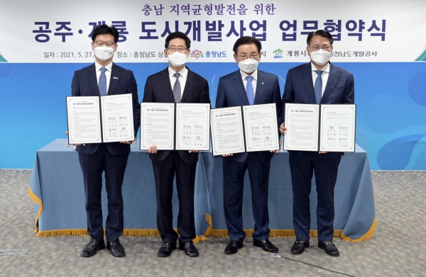 시는 27일 충남도청에서 양승조 도지사와 김정섭 시장, 정석완 충남개발공사 사장 등이 참석한 가운데 ‘충남 지역균형 발전을 위한 도시개발사업’ 추진을 위한 업무협약을 체결하고 언론브리핑을 통해 공식 발표했다고 밝혔다.