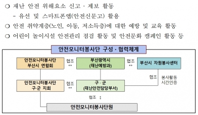 한편 부산시 안전모니터봉사단은 지난 2009년에 발족한 민간 자원봉사단체로서 시민들의 안전을 위해하는 현장을 제보하는 안전 파수꾼 역할을 수행하고 있다. 부산에는 16개 구·군 809명의 봉사단이 구군별 지부를 구성하여 활동하고 있으며 생활·교통·환경·건축물·화재 등 다양한 분야의 안전 위협요소를 제보하고 어린이 놀이시설에 대한 안전점검을 시행하는 등 활발한 활동을 펼치고 있다.