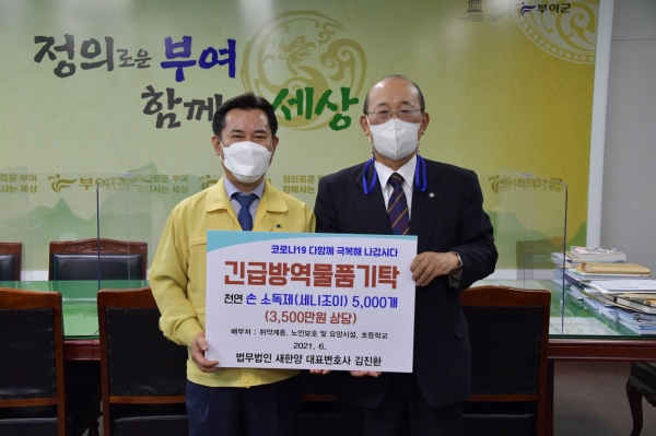 [충청뉴스큐] 부여군은 2일 법무법인 새한양 김진환 대표변호사가 코로나19로부터 군민을 건강하게 보호할 수 있도록 해 달라며 3,500만원 상당의 손 소독제 5,000개를 기탁했다고 밝혔다.
