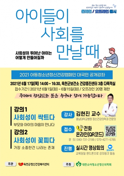 옥천군정신건강복지센터는 2019년부터 아동·청소년 정신건강 주민강좌를 매년 진행해 올해는 “아이가 사회를 만날 때”를 주제로 진행한다.